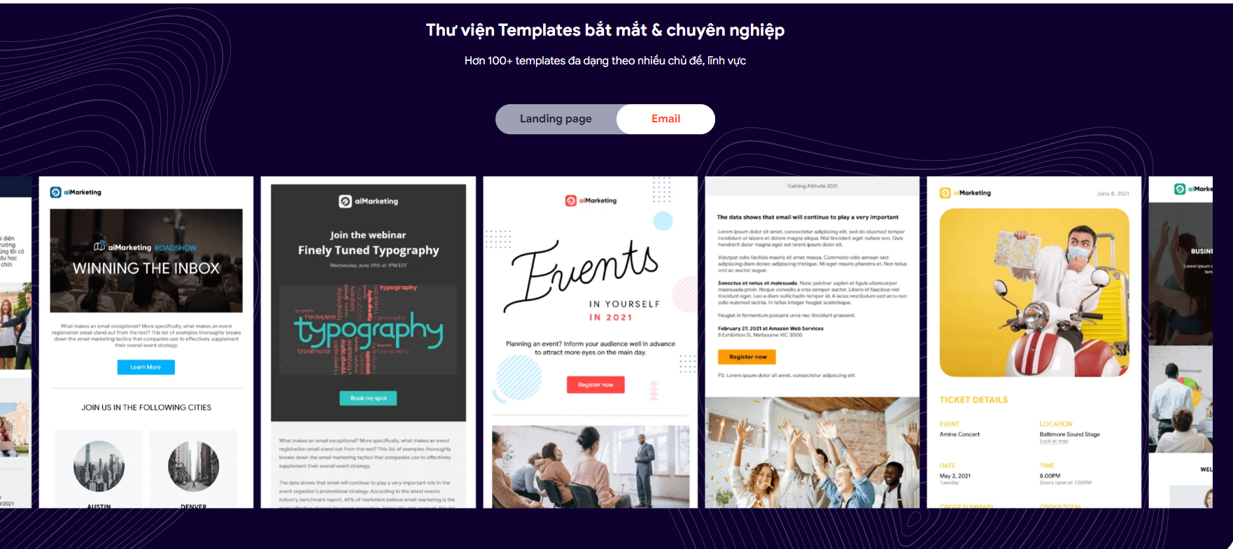 Bên cạnh đó, để giúp người dùng thiết kế email nhanh chóng, MISA AMIS aiMarketing có kho mẫu email với hơn 100+ template đa dạng cho nhiều ngành nghề/lĩnh vực/sản phẩm/mục đích.
