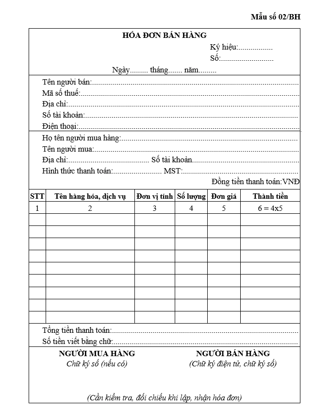 Mẫu 02/BH -Hóa đơn điện tử bán hàng (dùng cho tổ chức, cá nhân khai thuế giá trị gia tăng theo phương pháp trực tiếp) được ban hành kèm theo phụ lục III Nghị định 123/2020/NĐ-CP