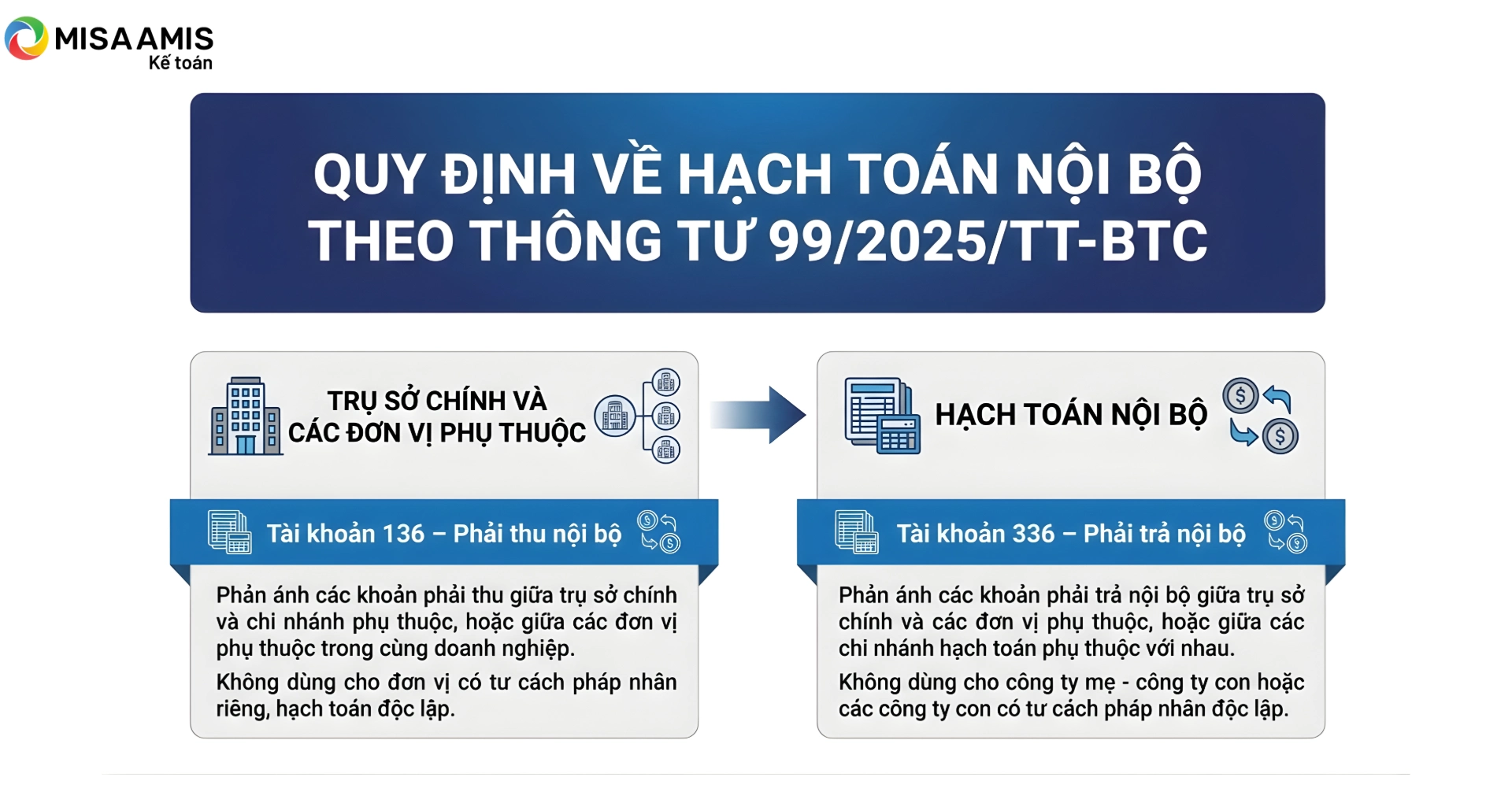 Theo quy định tại Thông tư 99/2025/TT-BTC (Thông tư thay thế Thông tư 200/2014/TT-BTC) về chế độ kế toán doanh nghiệp, các nghiệp vụ phát sinh giữa trụ sở chính và chi nhánh hạch toán phụ thuộc hoặc giữa các đơn vị phụ thuộc trong cùng doanh nghiệp cần được theo dõi riêng thông qua các tài khoản phải thu, phải trả nội bộ. Cụ thể: