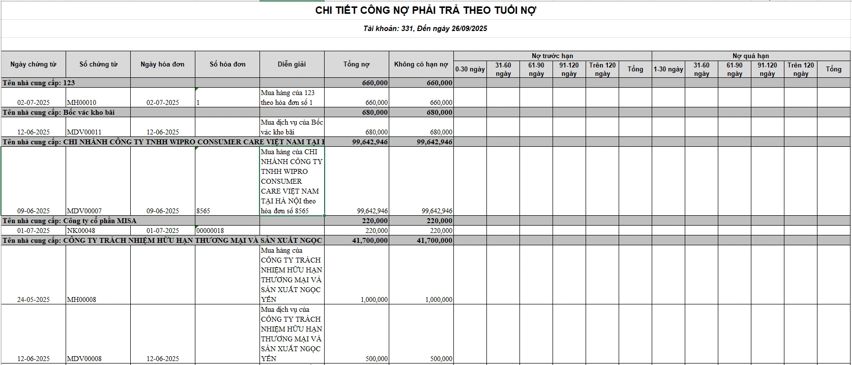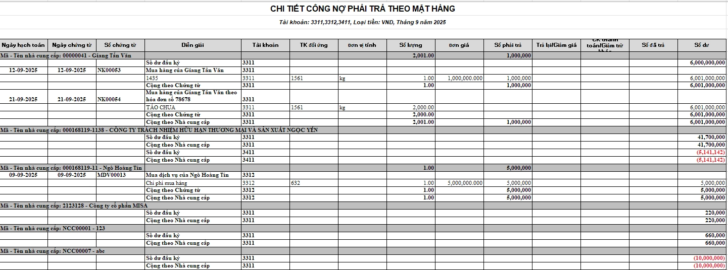 | STT | Mã NCC | Tên nhà cung cấp | Ngày phát sinh | Số chứng từ | Diễn giải | Số tiền phát sinh | Đã trả | Còn lại | Hạn thanh toán | Ghi chú |