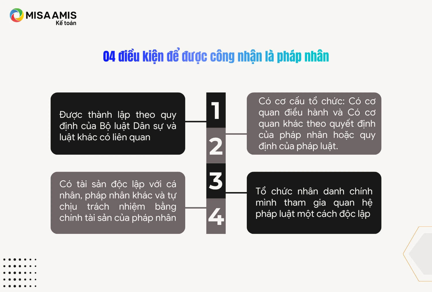 Pháp nhân mở ra cánh cửa giúp doanh nghiệp khẳng định vị thế trong kỷ nguyên số. Doanh nghiệp nắm vững các quy định về pháp nhân – từ thành lập, vận hành, đến chia tách, sáp nhập, hay giải thể – sẽ đảm bảo tuân thủ pháp luật, bảo vệ tài sản, và xây dựng uy tín lâu dài. Kết hợp cùng giải pháp công nghệ hiện đại như MISA AMIS, doanh nghiệp quản lý tài chính, hóa đơn điện tử, và quy trình vận hành một cách minh bạch, hiệu quả. Với sự đồng hành của MISA AMIS, doanh nghiệp sẵn sàng vượt qua thách thức, nắm bắt cơ hội, và chinh phục những đỉnh cao mới trên thị trường.