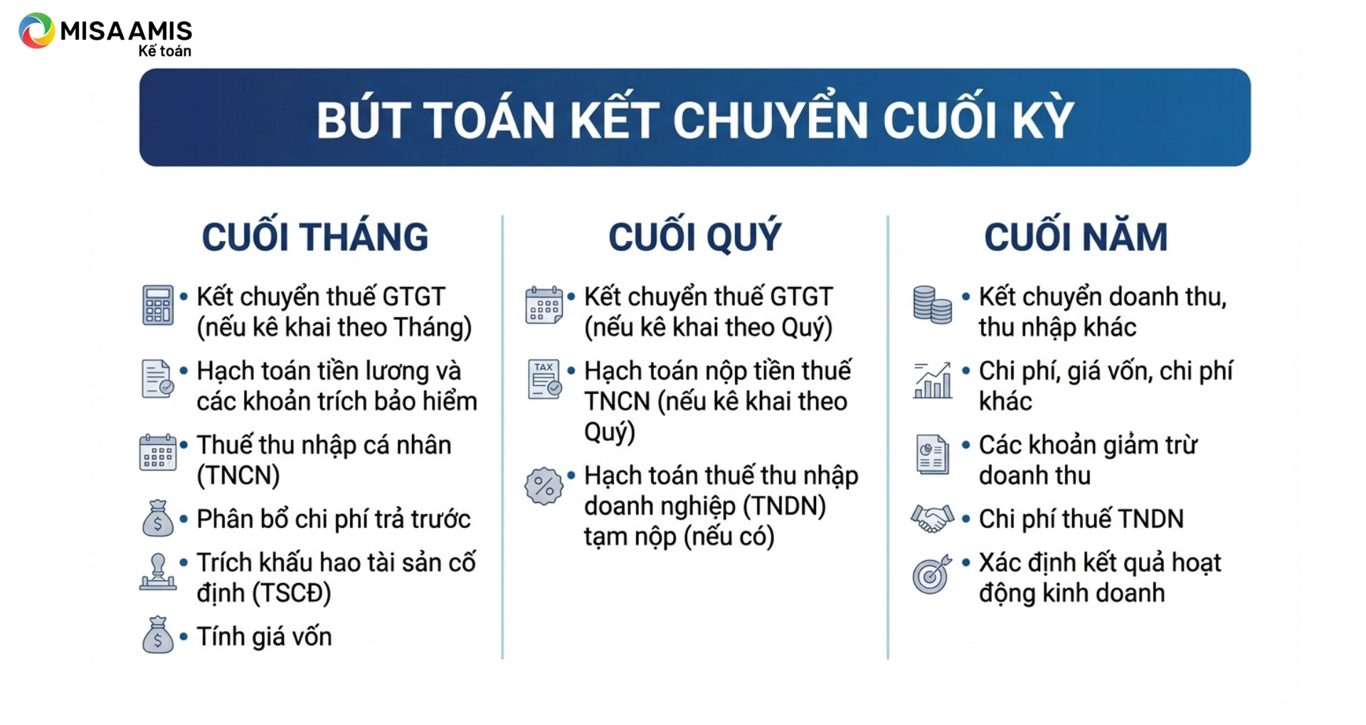 Bút toán kết chuyển cuối kỳ bao gồm kết chuyển cuối Tháng, cuối Quý và cuối Năm: