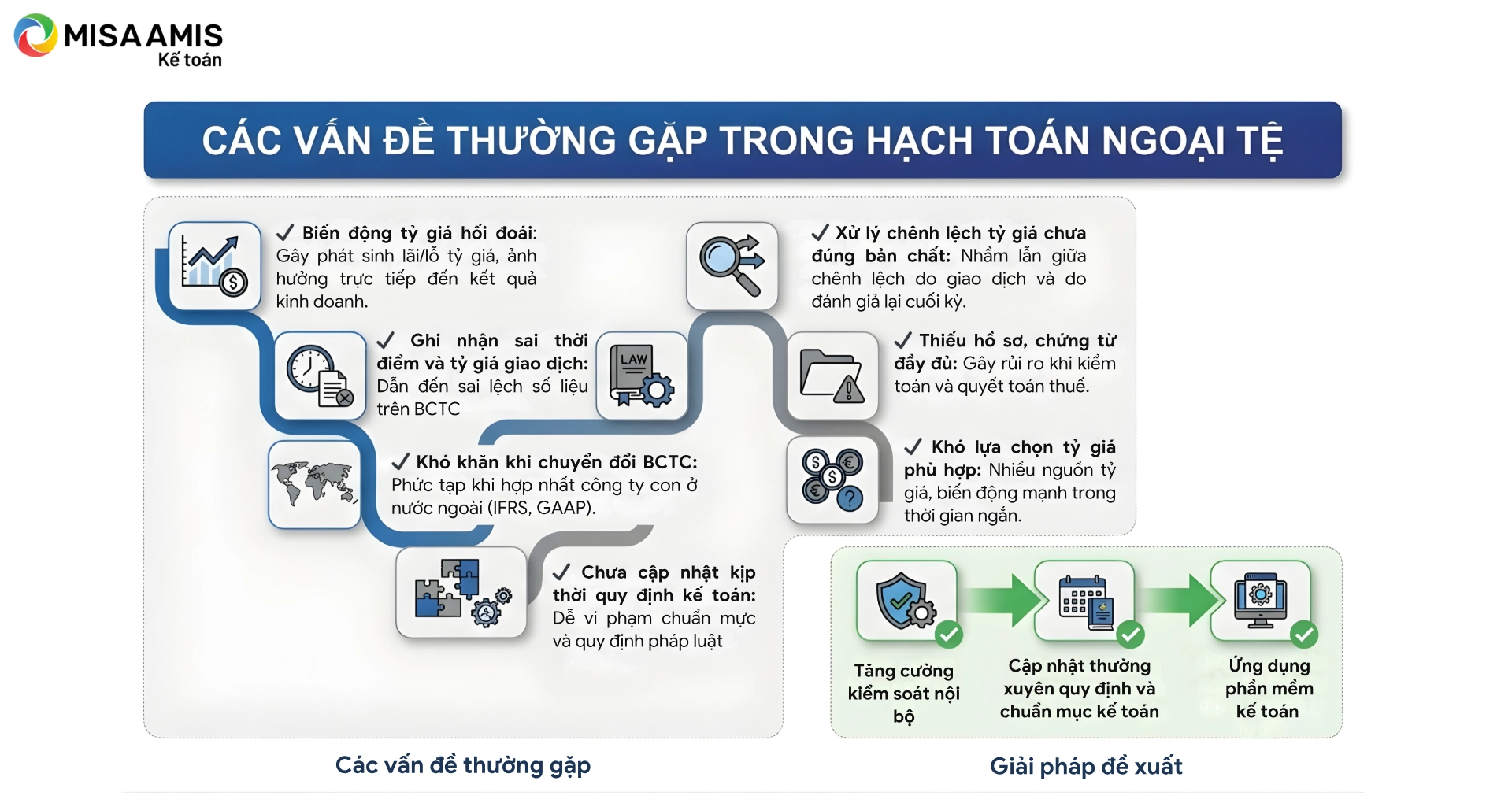 Để giải quyết những vấn đề này, các doanh nghiệp cần đảm bảo quy trình kiểm soát nội bộ chặt chẽ, liên tục cập nhật kiến thức về các quy định kế toán, và áp dụng các hệ thống kế toán hiện đại có khả năng tự động hóa việc tính toán và ghi nhận tỷ giá hối đoái.
