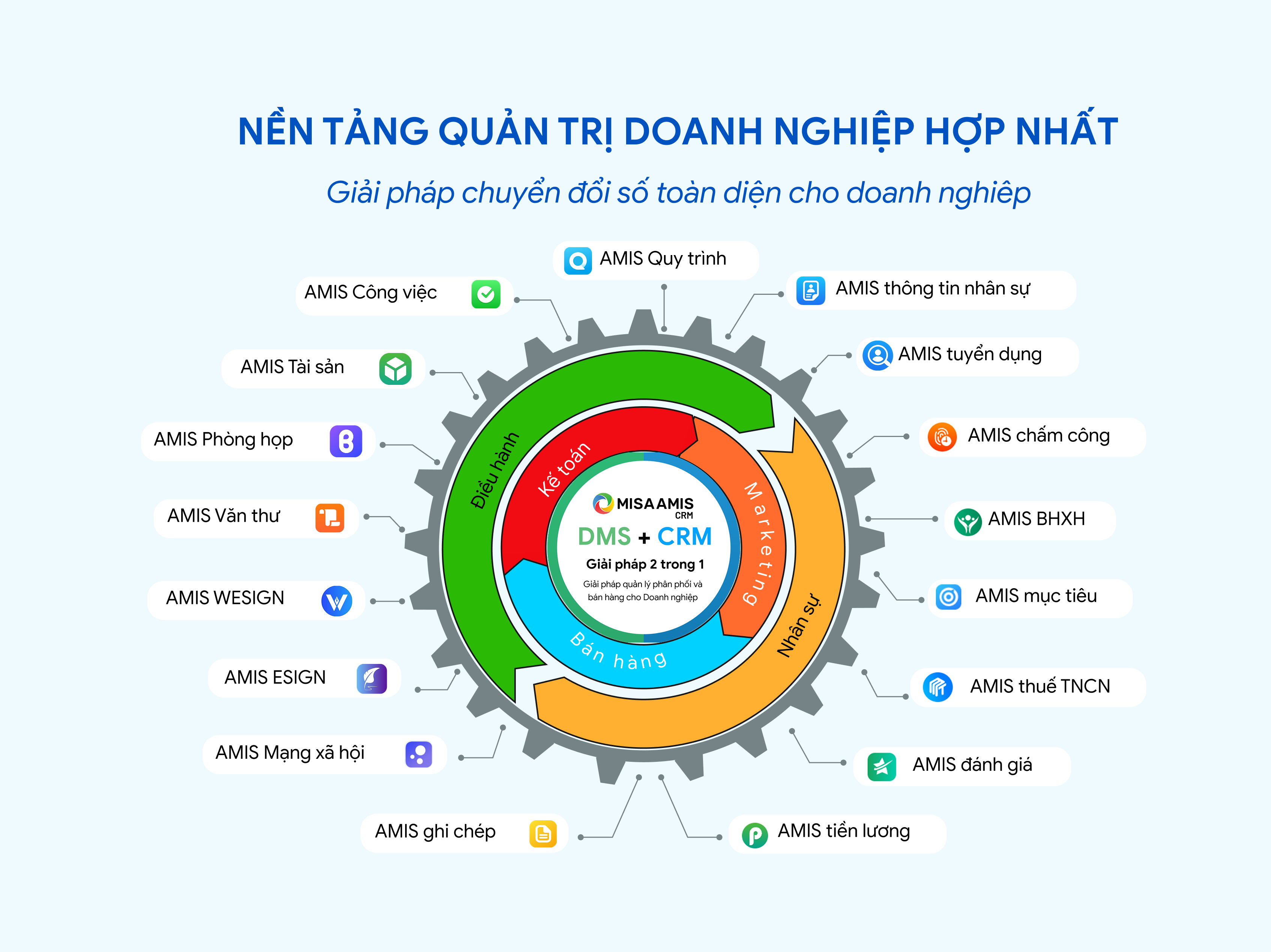 MISA AMIS mang đến hơn 40+ ứng dụng chuyên biệt, giúp doanh nghiệp tối ưu vận hành và kết nối dữ liệu đồng bộ trong các lĩnh vực Tài chính – Kế toán, Marketing – Bán hàng, Nhân sự và Văn phòng số