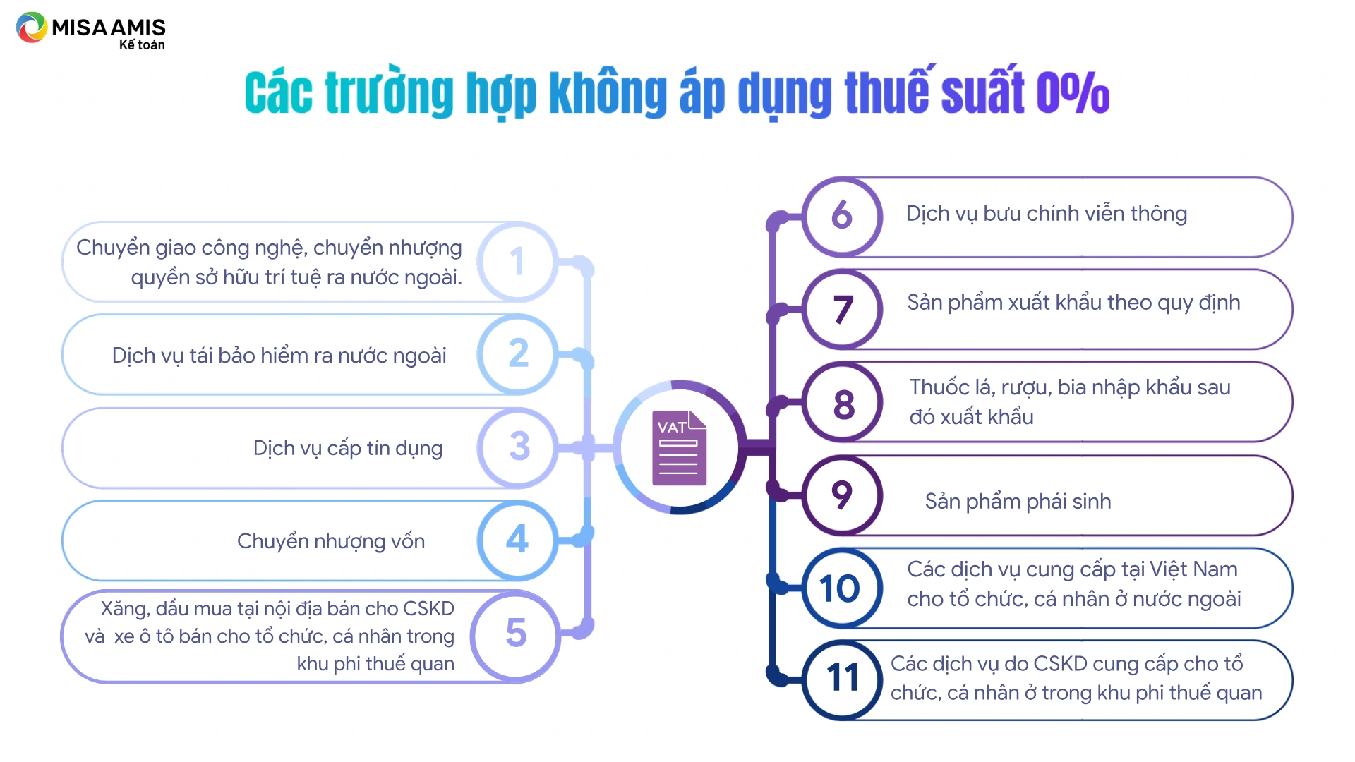 Theo quy định tại khoản 4 Điều 17 Nghị định 181/2025/NĐ-CP, mức thuế suất 0% không áp dụng đối với các trường hợp sau đây: