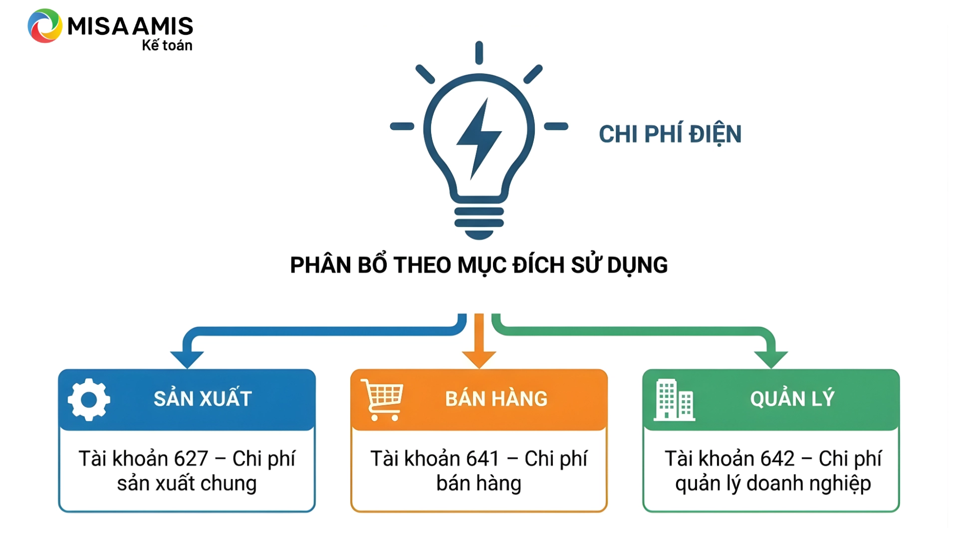 Tuy nhiên, tùy theo mục đích sử dụng, chi phí điện có thể được hạch toán vào các tài khoản khác nhau: