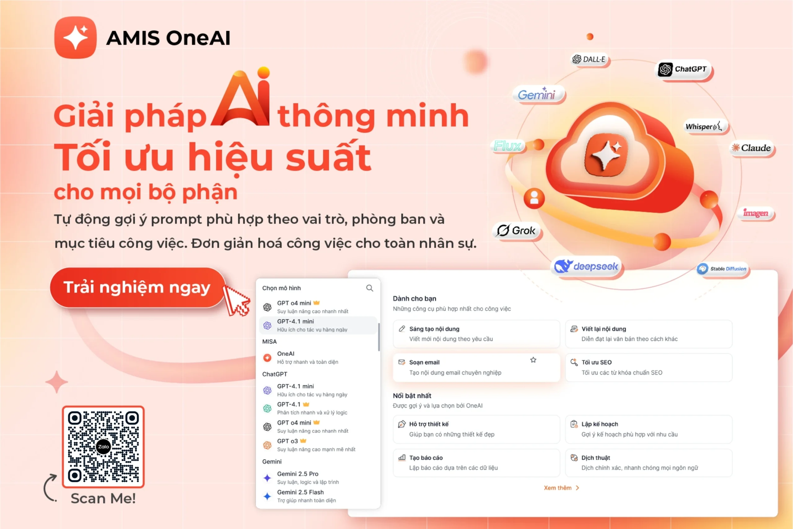 Chỉ vừa ra mắt năm 2025 nhưng MISA AMIS OneAI đã gây ấn tượng mạnh mẽ với cộng đồng marketers vì tích hợp hàng loạt model AI hàng đầu thế giới như ChatGPT, Gemini, Grok, Claude, DeepSeek, DALL·E 3, Stable Diffusion,…