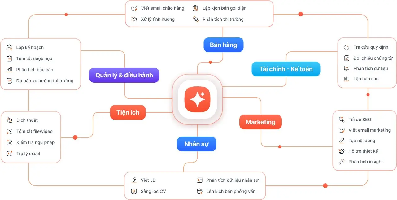 Từ Sales, Marketing, Nhân sự, Kế toán đến CEO, AMIS OneAI cung cấp các mô hình, mẫu prompt phù hợp với từng bộ phận, giúp tăng năng suất, giảm thiểu thời gian đào tạo và cải thiện hiệu quả công việc.