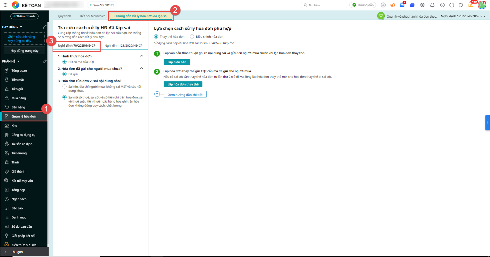 - Vào mục Quản lý hóa đơn -> Tab Hướng dẫn xử lý hóa đơn đã lập sai -> chọn Nghị định 70/2025/NĐ-CP.