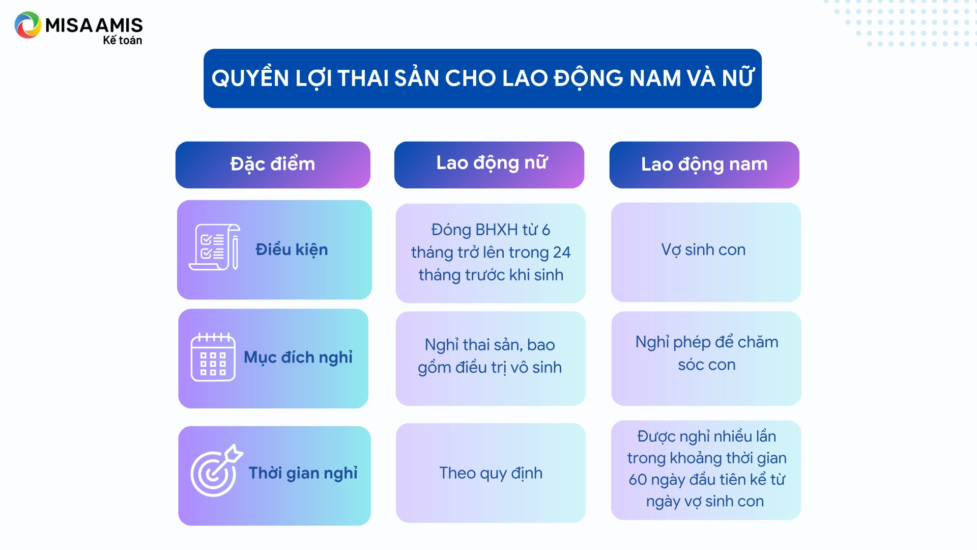- Lao động nữ được nghỉ và hưởng chế độ thai sản nếu đã đóng BHXH từ 6 tháng trở lên trong vòng 24 tháng trước khi sinh, bao gồm cả trường hợp nghỉ việc để điều trị vô sinh (theo khoản 5 Điều 50 Luật BHXH 2024).