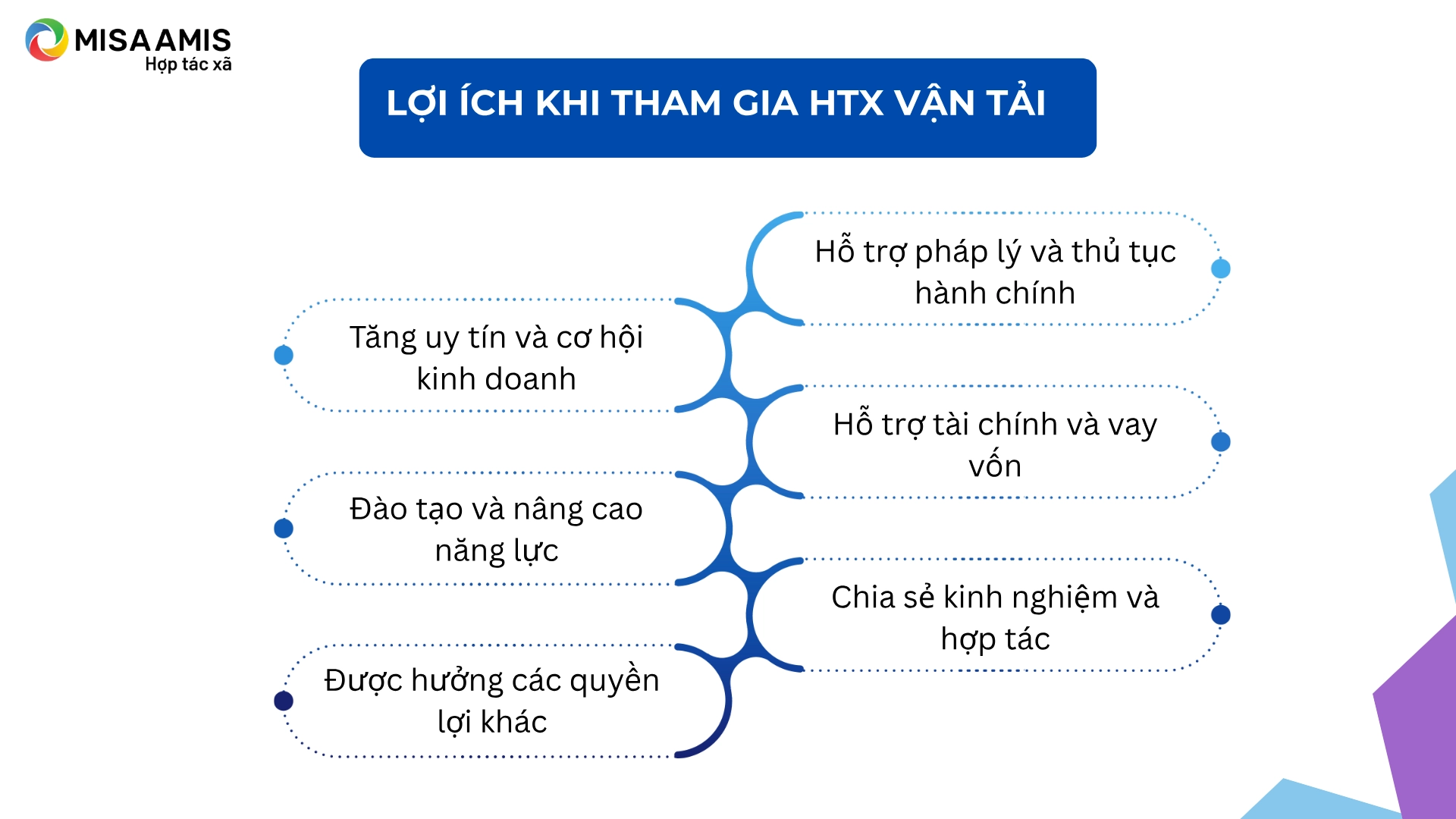 Tham gia một Hợp tác xã vận tải (HTX vận tải) mang lại nhiều lợi ích cho các cá nhân, tổ chức trong ngành vận tải, đặc biệt là đối với các chủ phương tiện không có doanh nghiệp riêng.