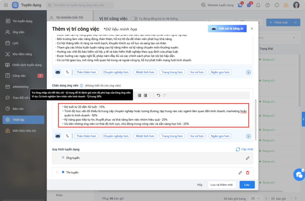 - Soạn thảo nội dung tuyển dụng nhanh chóng: Chỉ cần nhập tên vị trí và vài thông tin cơ bản, hệ thống sẽ gợi ý đầy đủ phần mô tả công việc, yêu cầu, phúc lợi, cùng tiêu đề hấp dẫn và hình ảnh tuyển dụng phù hợp.
