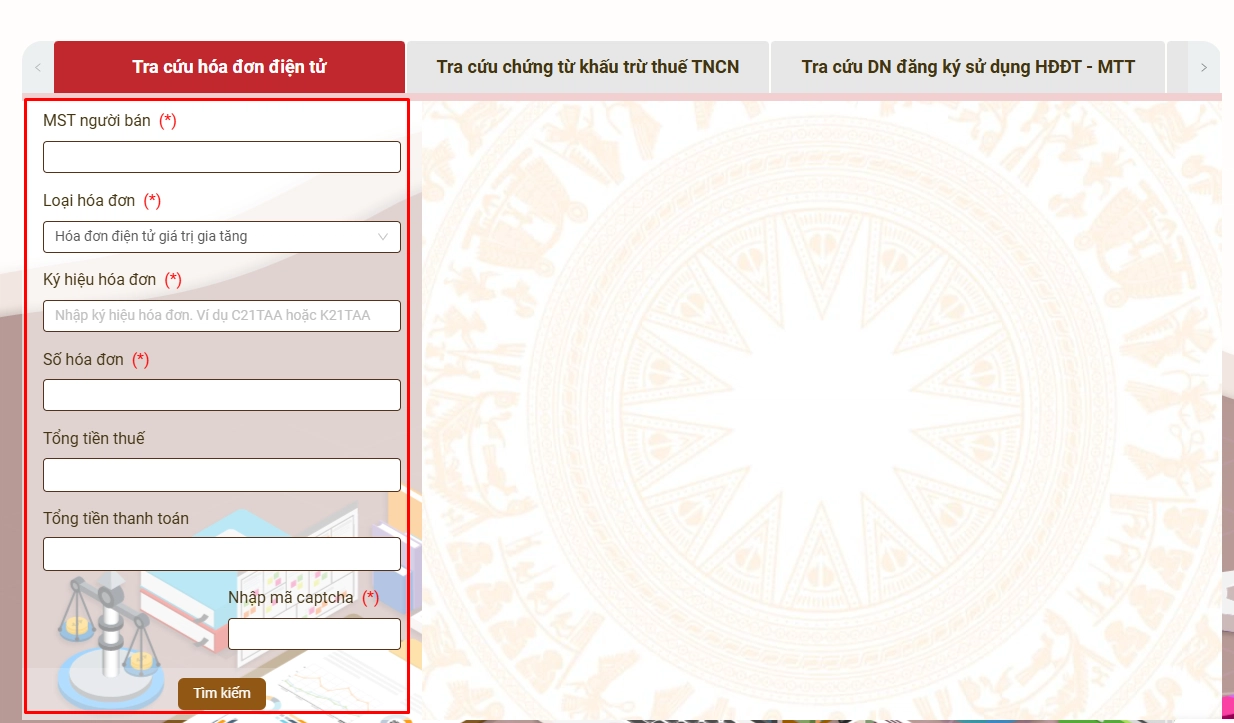 Bước 2: Nhập mã số thuế, loại hóa đơn, kỳ hiệu hóa đơn, số hóa đơn, tổng tiền thanh toán và mã captcha => Nhấn [Tìm kiếm].