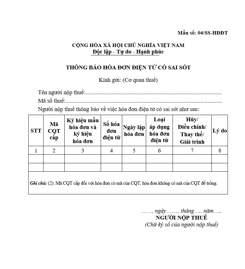 1. Mẫu số 04/SS-HĐĐT Thông báo hóa đơn điện tử đã lập sai theo Nghị định 70/2025/NĐ-CP