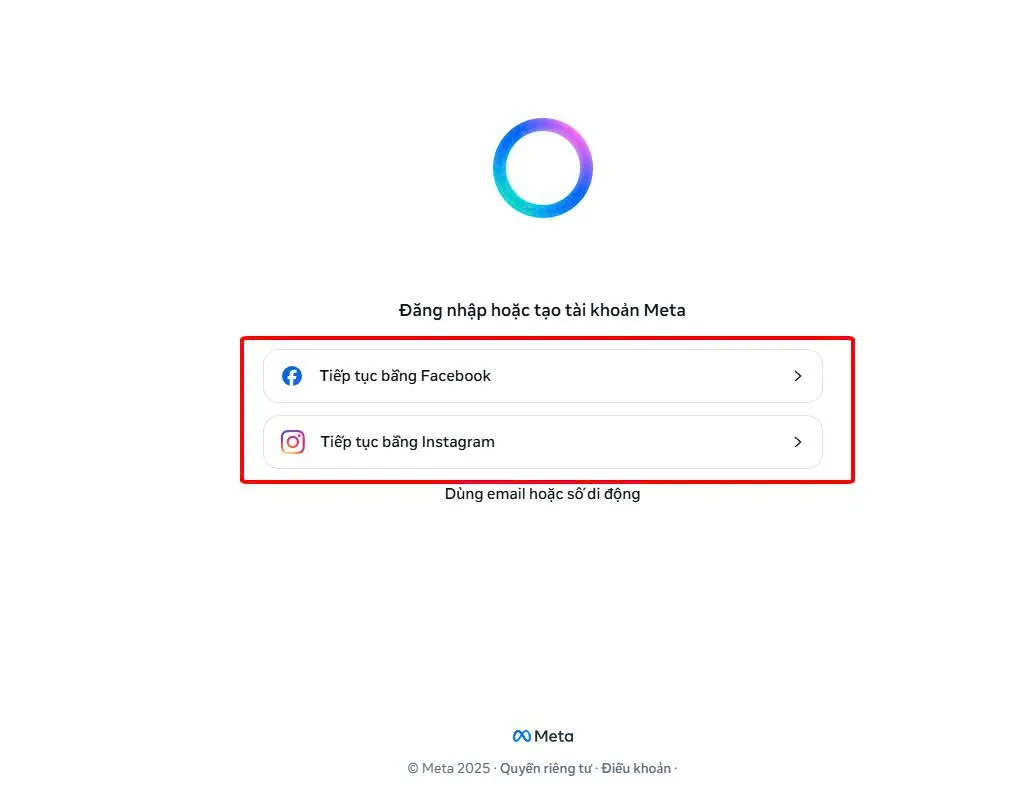 Bước 2: Chọn phương thức đăng nhập qua tài khoản Facebook hoặc Instagram của bạn.