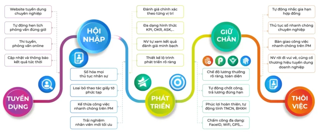 - Quản lý phúc lợi – lương thưởng – đánh giá: Minh bạch, xuyên suốt ở mọi giai đoạn, hỗ trợ giữ chân nhân tài.