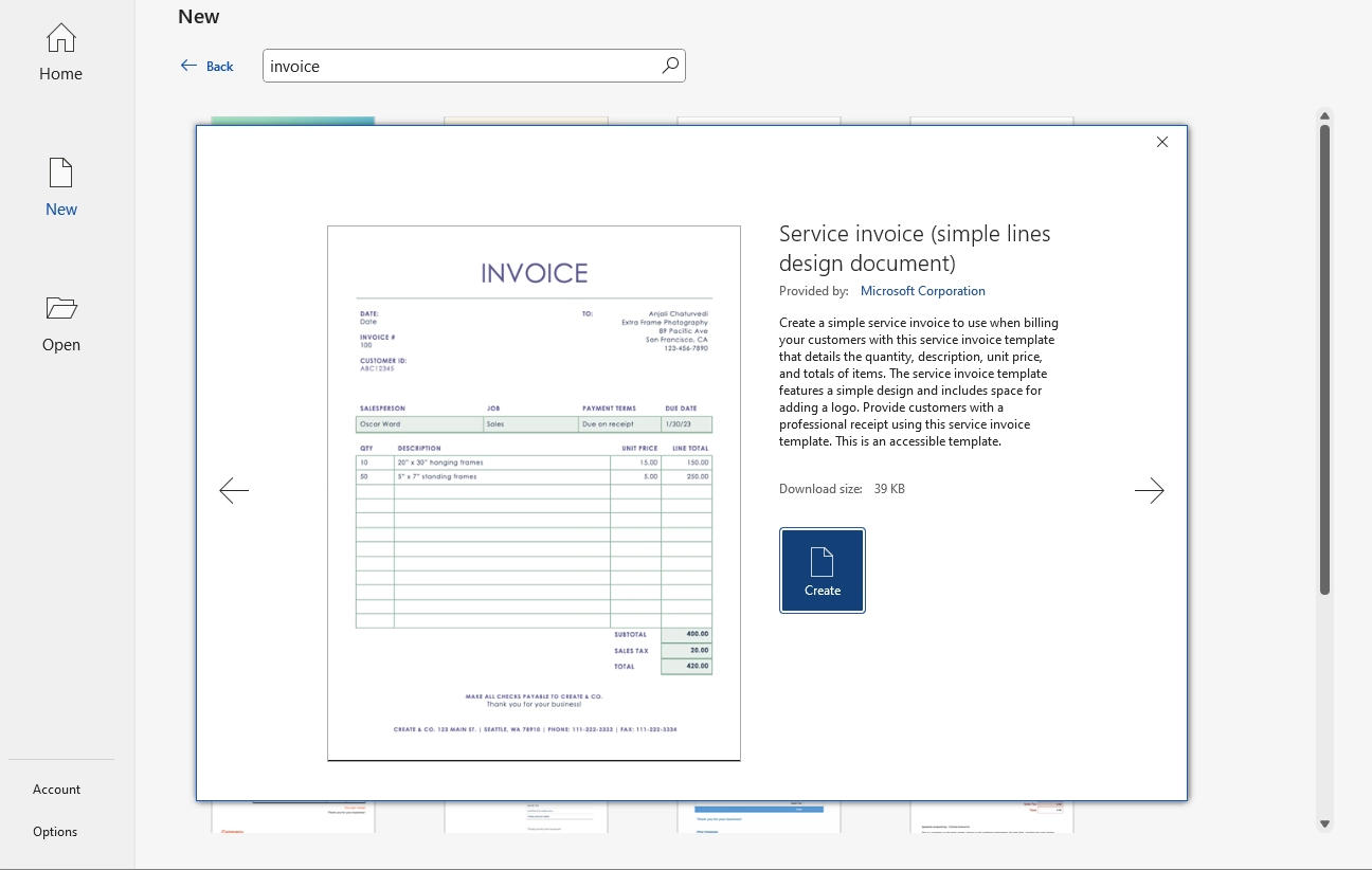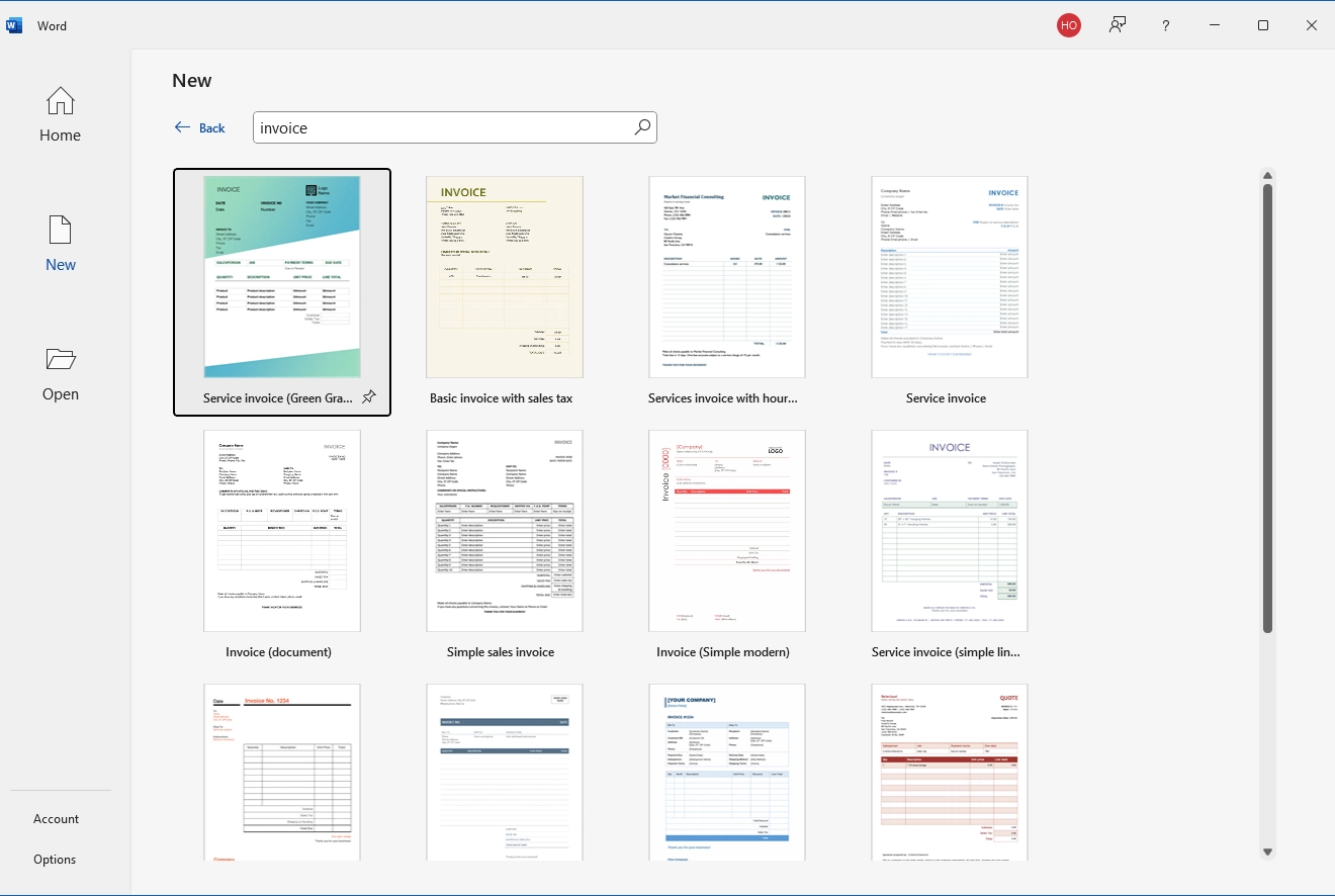 Tại ô tìm kiếm, gõ từ khóa “invoice”. Word sẽ hiển thị hàng loạt mẫu hóa đơn khác nhau như: sales invoice, service invoice, product invoice, v.v.