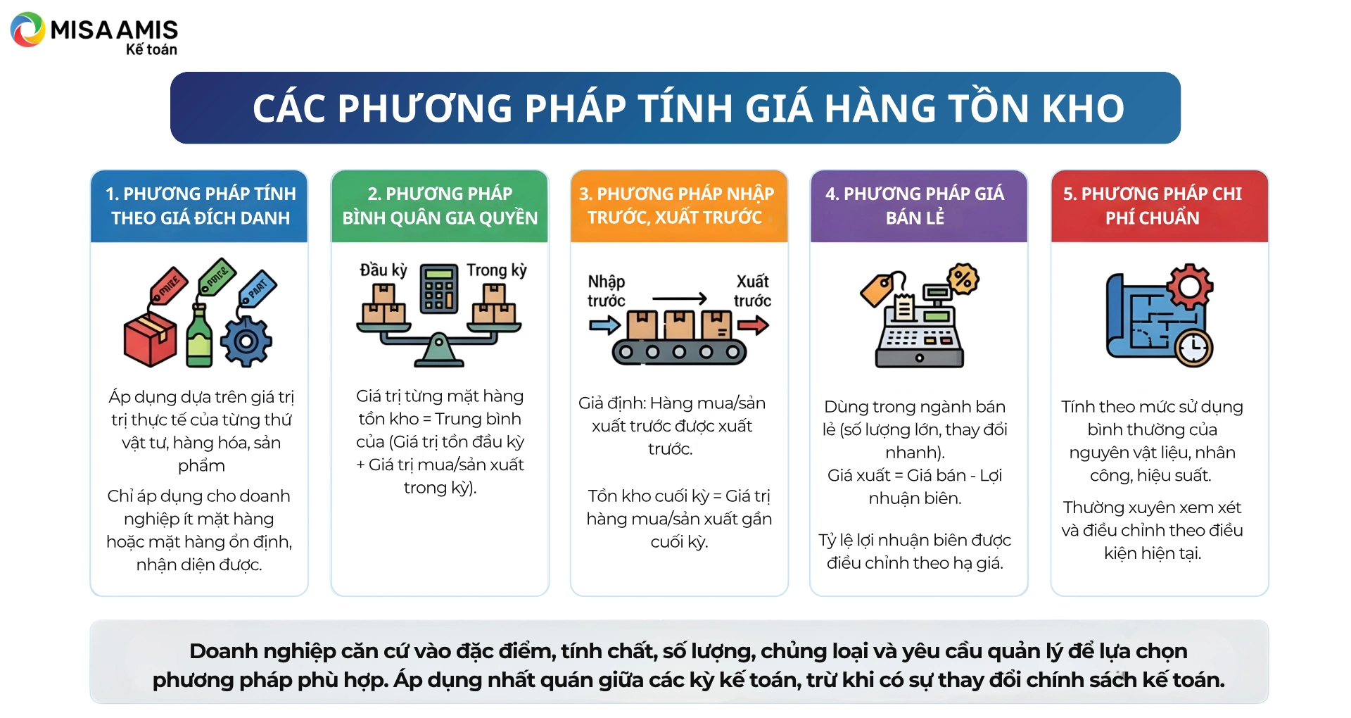 Lưu ý: Trong một doanh nghiệp, chỉ được áp dụng một trong hai phương pháp kế toán hàng tồn kho: Phương pháp kê khai thường xuyên hoặc Phương pháp kiểm kê định kỳ. Việc lựa chọn phương pháp kế toán hàng tồn kho áp dụng tại doanh nghiệp phải căn cứ vào đặc điểm, tính chất, số lượng, chủng loại vật tư hàng hóa và yêu cầu quản lý để có sự vận dụng thích hợp và phải được thực hiện nhất quán trong niên độ kế toán.
