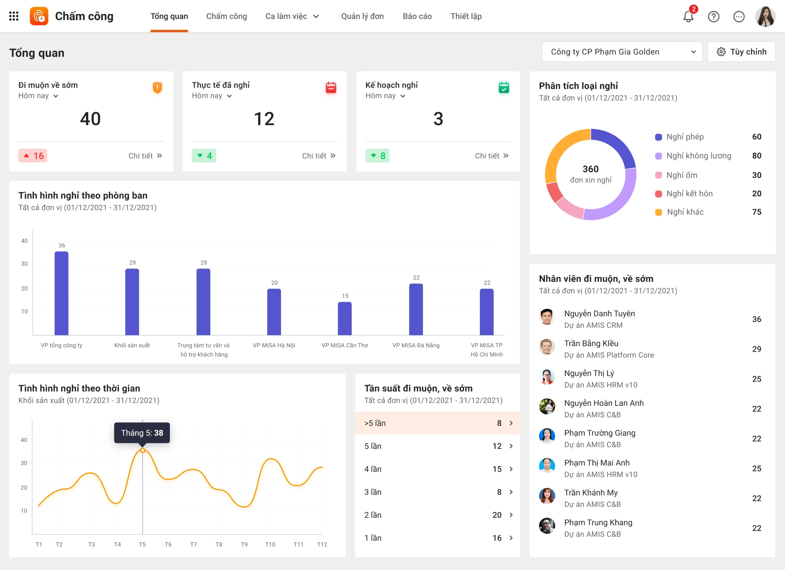 | Tổng hợp cuối tháng | Tổng công, tổng nghỉ phép, tổng OT, số lần đi muộn/về sớm |