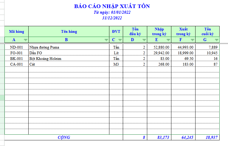 Đây là phần quan trọng nhất trong File Google Sheet nhập xuất tồn kho, chứa các công thức tự động để tính tồn cuối kỳ = tồn đầu + nhập – xuất. Dữ liệu được cập nhật theo thời gian thực mỗi khi có phiếu nhập hoặc xuất, giúp doanh nghiệp dễ dàng theo dõi tình hình tồn kho tại mọi thời điểm.