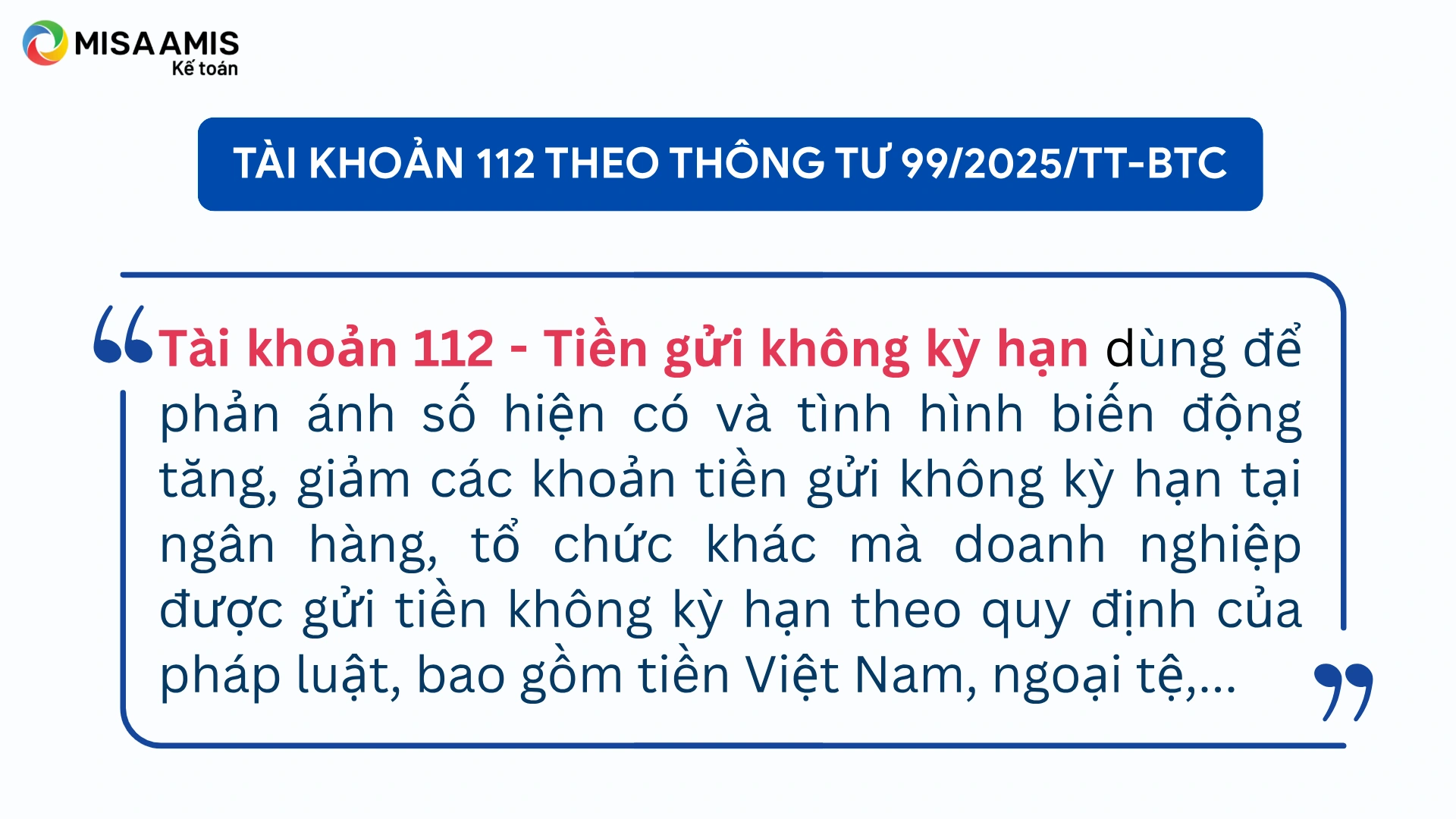 Tài khoản 112 theo Thông tư 99 được đổi tên từ “Tiền gửi Ngân hàng” thành “Tiền gửi không kỳ hạn”. Điểm khác biệt lớn là phạm vi áp dụng mở rộng thêm các tổ chức tài chính khác ngoài ngân hàng, nếu pháp luật cho phép doanh nghiệp gửi tiền không kỳ hạn tại đó. Ngoài ra, vàng tiền tệ không còn phản ánh trong TK 112 như ở Thông tư 200.
