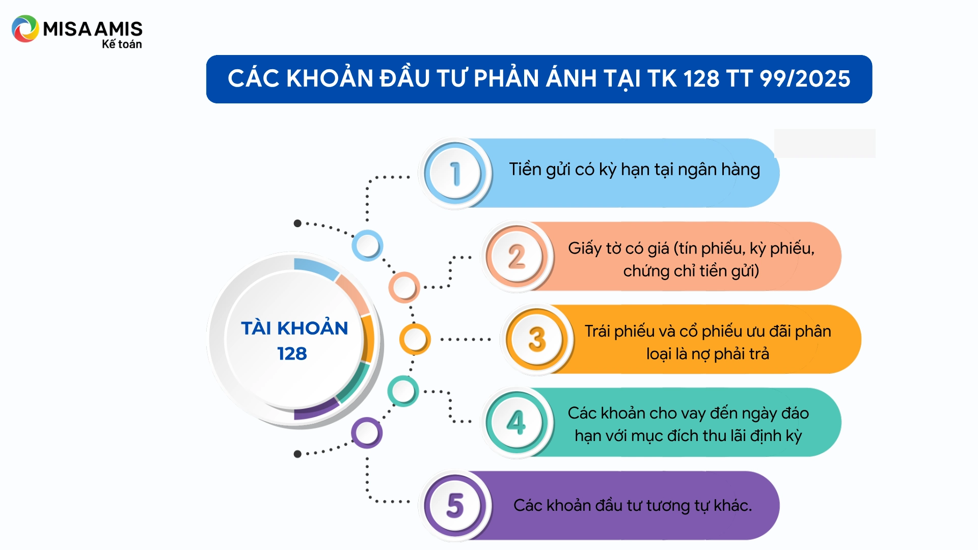 Tài khoản 128 theo Thông tư 99/2025/TT-BTC có nhiều quy định chi tiết, cụ thể hơn về nguyên tắc kế toán, cách hạch toán các khoản đầu tư nắm giữ đến ngày đáo hạn như trái phiếu, tiền gửi có kỳ hạn, cho vay… Việc nắm rõ và áp dụng chính xác sẽ giúp doanh nghiệp phản ánh đúng bản chất tài sản tài chính, kiểm soát tốt dòng tiền và tuân thủ đúng quy định kế toán hiện hành.