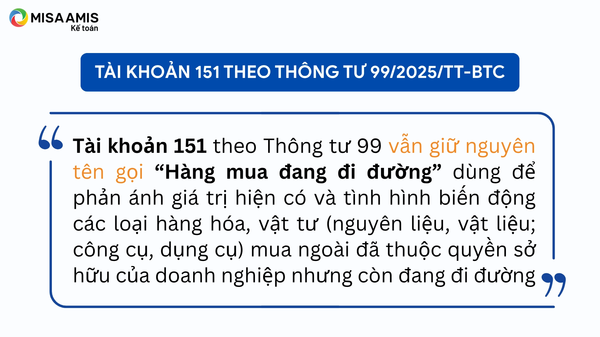 Tài khoản 151 – Hàng mua đang đi đường theo Thông tư 99/2025/TT-BTC là tài khoản dùng để phản ánh  giá trị hiện có và diễn biến biến động của các mặt hàng hóa, vật tư (bao gồm nguyên liệu, vật liệu; công cụ, dụng cụ) mà doanh nghiệp đã mua nhưng đang trong quá trình vận chuyển hoặc chưa nhập kho.