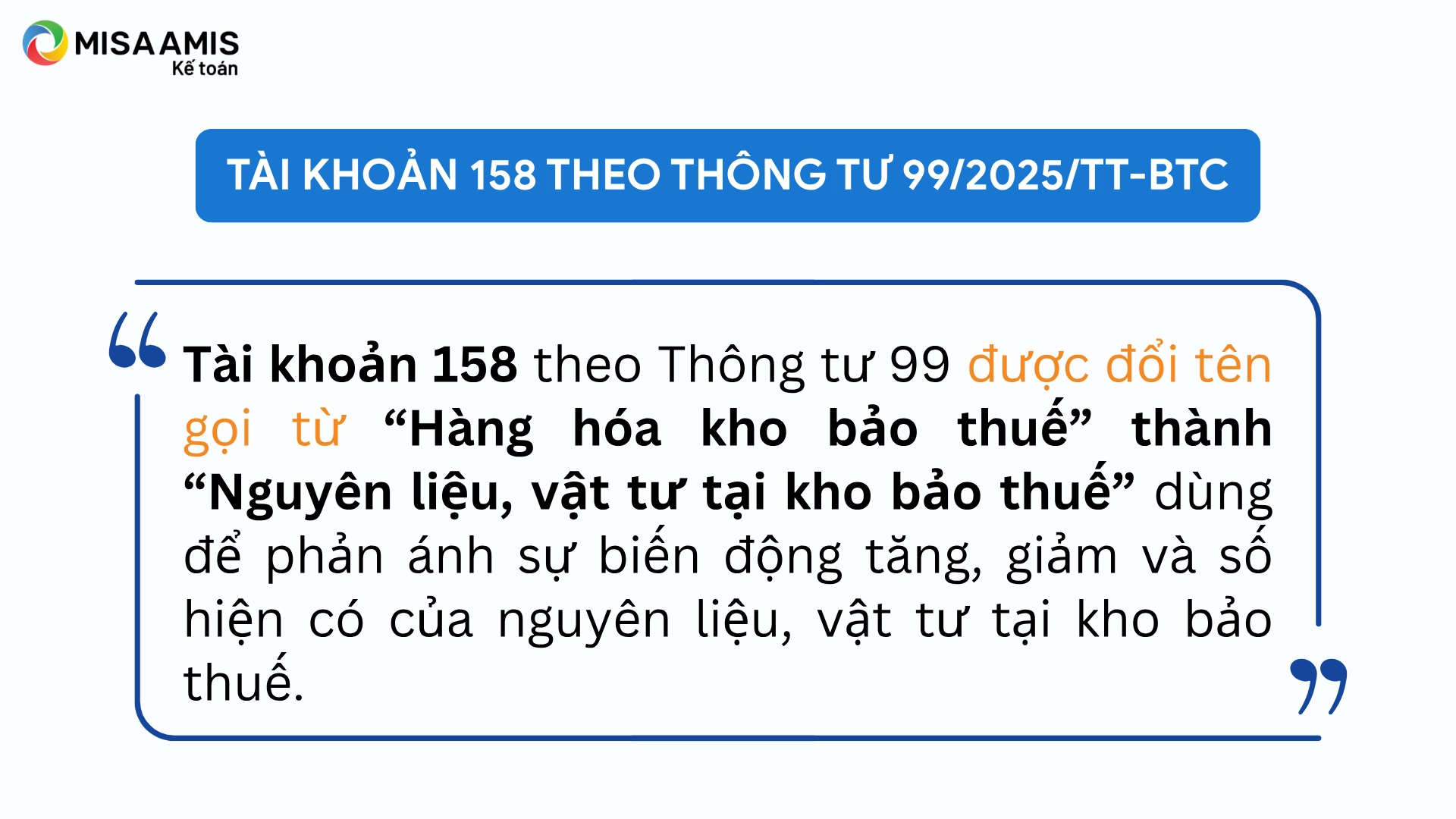 Theo Thông tư 200, TK 158 có tên là “Hàng hóa kho bảo thuế”, tuy nhiên đến Thông tư 99, tài khoản này được điều chỉnh tên gọi thành “ Nguyên liệu, vật tư tại kho bảo thuế” để phù hợp hơn với bản chất quản lý nguyên liệu, vật tư trong hoạt động sản xuất hàng xuất khẩu. Tài khoản này được sử dụng để phản ánh tình hình tăng, giảm và hiện có của nguyên liệu, vật tư nhập khẩu lưu giữ tại kho bảo thuế nhằm phục vụ sản xuất, gia công hàng xuất khẩu.