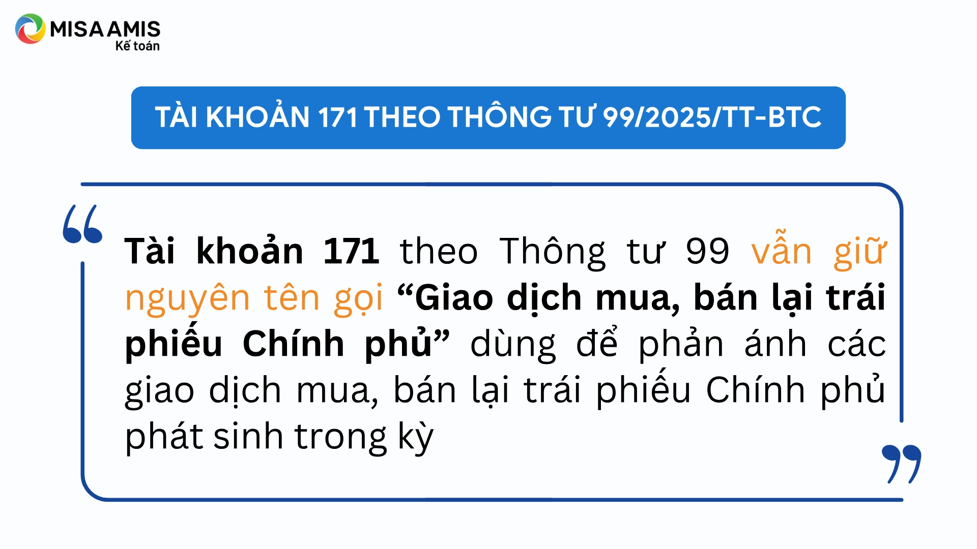 Tài khoản 171 theo Thông tư 99 vẫn giữ nguyên tên gọi “Giao dịch mua, bán lại trái phiếu Chính phủ”  được sử dụng để ghi nhận các nghiệp vụ phát sinh liên quan đến hoạt động mua và bán lại trái phiếu Chính phủ trong kỳ kế toán. Tài khoản chỉ phản ánh giá trị hợp đồng mua bán lại, không bao gồm khoản coupon mà bên mua tạm nhận thay bên bán trong thời gian hợp đồng còn hiệu lực.