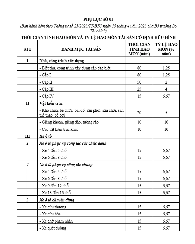Thời gian và tỷ lệ hao mòn TSCĐ hữu hình được thực hiện theo quy định tại Phụ lục số 01 ban hành kèm theo Thông tư 23/2023/TT-BTC, ngoại trừ các trường hợp sau: