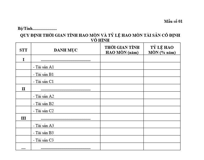 - Bộ trưởng, Thủ trưởng cơ quan trung ương và UBND cấp tỉnh có trách nhiệm quy định danh mục, thời gian và tỷ lệ hao mòn đối với TSCĐ vô hình (trừ thương hiệu của đơn vị sự nghiệp công lập) thuộc phạm vi quản lý của mình. Nội dung quy định thực hiện theo Mẫu số 01 tại Phụ lục số 02 ban hành kèm theo Thông tư này.