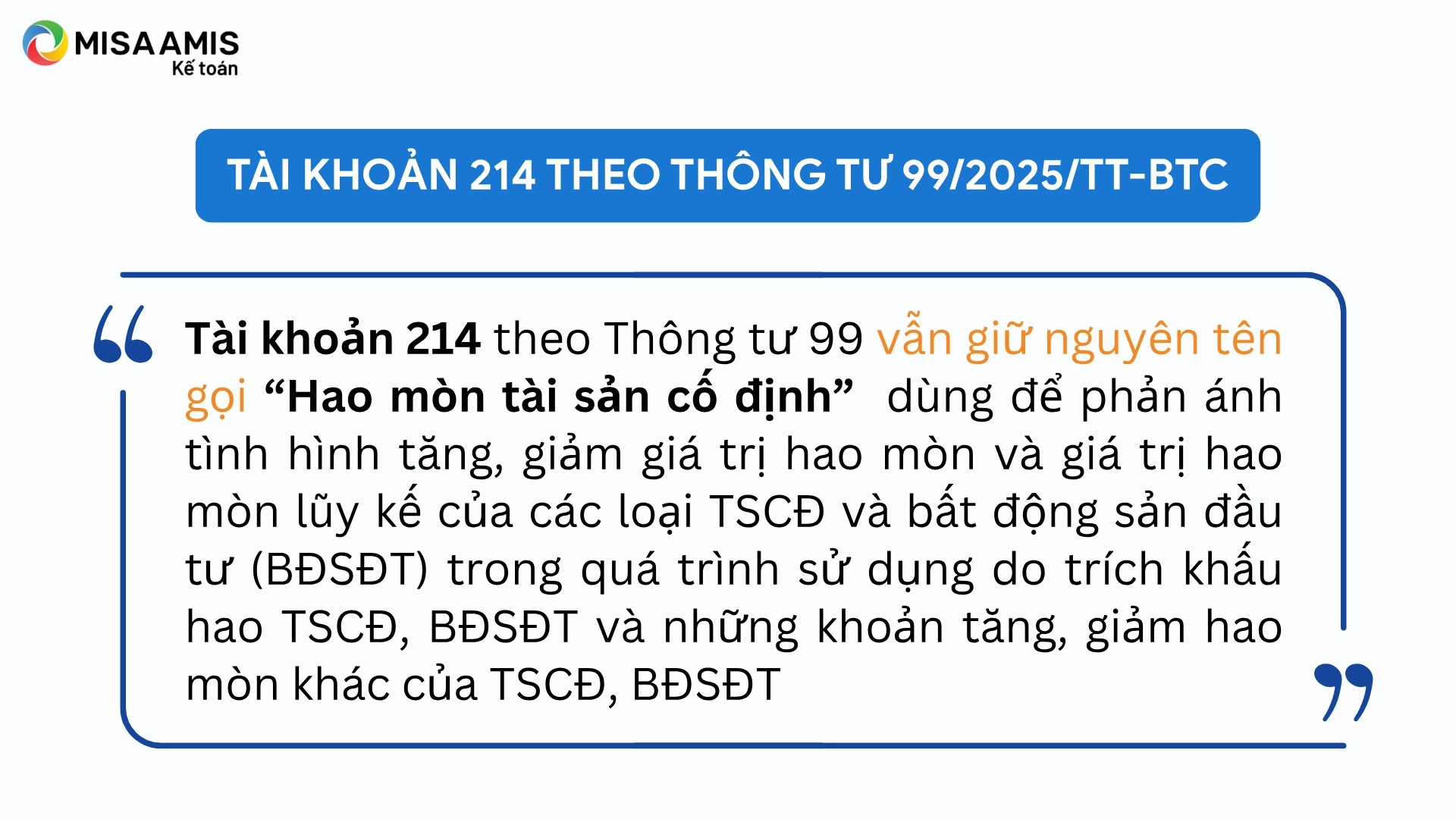 Tài khoản 214 là tài khoản quan trọng trong hệ thống kế toán doanh nghiệp, dùng để phản ánh giá trị hao mòn lũy kế của tài sản cố định và bất động sản đầu tư. Theo Thông tư 99/2025/TT-BTC mới nhất của Bộ Tài chính, quy định về trích khấu hao và ghi nhận hao mòn tài sản đã có nhiều điểm cập nhật đáng chú ý.