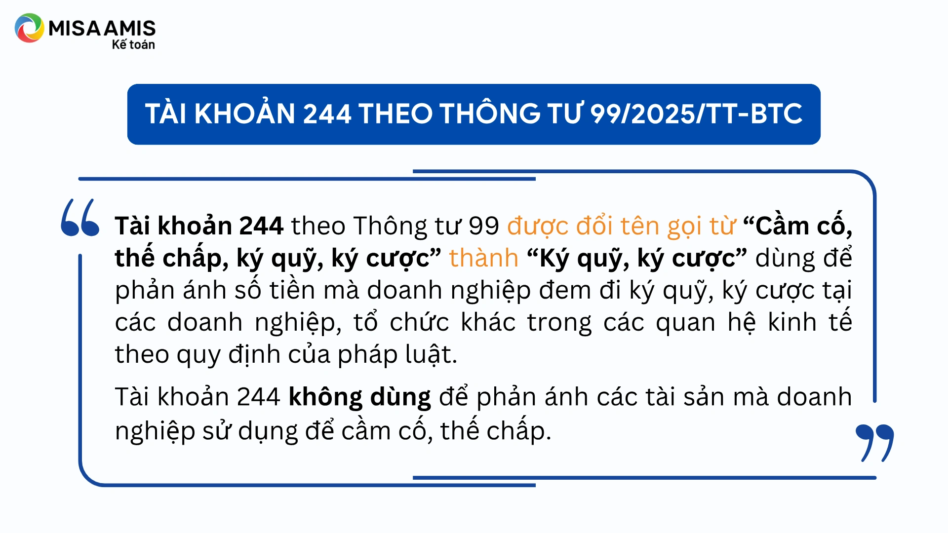Tuy nhiên, kể từ Thông tư 99/2025/TT-BTC, tài khoản 244 đã được đổi tên thành “Ký quỹ, ký cược”, chỉ dùng để phản ánh các khoản tiền doanh nghiệp đem đi ký quỹ, ký cược trong các quan hệ kinh tế theo quy định của pháp luật, không dùng tài khoản này để phản ánh các tài sản mà doanh nghiệp sử dụng để cầm cố, thế chấp.