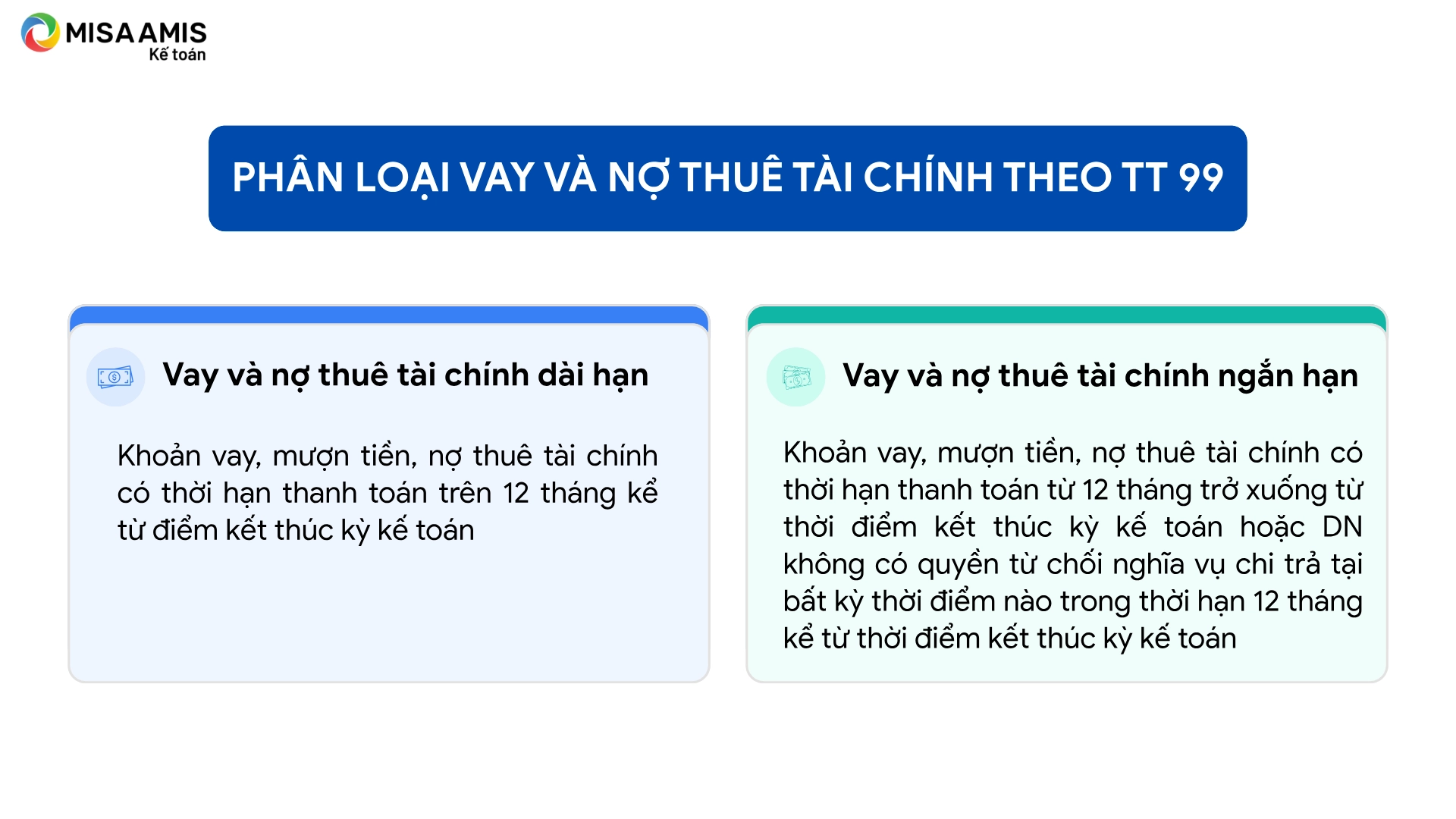 - Khoản vay, mượn tiền, nợ thuê tài chính có thời hạn thanh toán từ 12 tháng trở xuống từ thời điểm kết thúc kỳ kế toán hoặc doanh nghiệp không có quyền từ chối nghĩa vụ chi trả tại bất kỳ thời điểm nào trong thời hạn 12 tháng kể từ thời điểm kết thúc kỳ kế toán: phải được trình bày là vay và nợ thuê tài chính ngắn hạn.