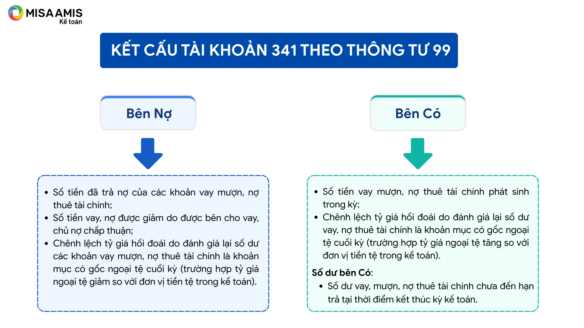 Tài khoản 341 theo Thông tư 99 là tài khoản dùng để phản ánh các khoản vay mượn và nợ thuê tài chính của doanh nghiệp, đi kèm với những thay đổi quan trọng so với Thông tư 200.