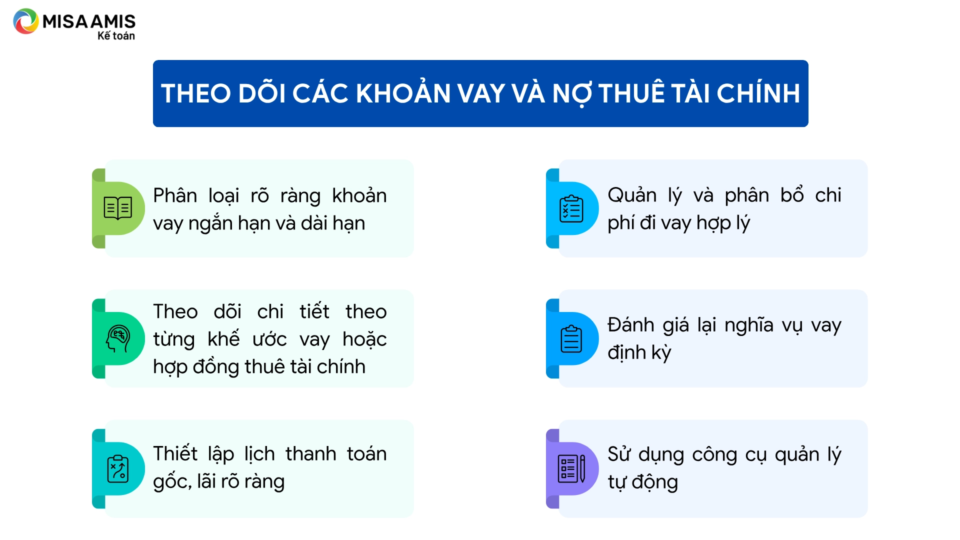 - Đánh giá lại nghĩa vụ vay định kỳ: Với các khoản nợ thuê tài chính, cần định kỳ rà soát lại nghĩa vụ phải trả và phân bổ vào chi phí từng kỳ theo đúng giá trị hiện tại hoặc giá trị hợp lý của tài sản thuê.