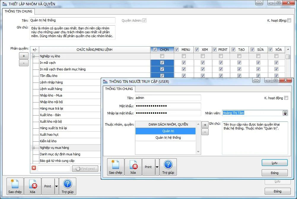 | Phân quyền & quản lý người dùng | Có phân quyền chi tiết theo nhóm người dùng, phù hợp khi nhiều người cùng thao tác kho. | Có phân quyền theo kho, theo người dùng — phù hợp doanh nghiệp có nhiều chi nhánh/kho, cần bảo mật & kiểm soát quyền truy cập kho. |