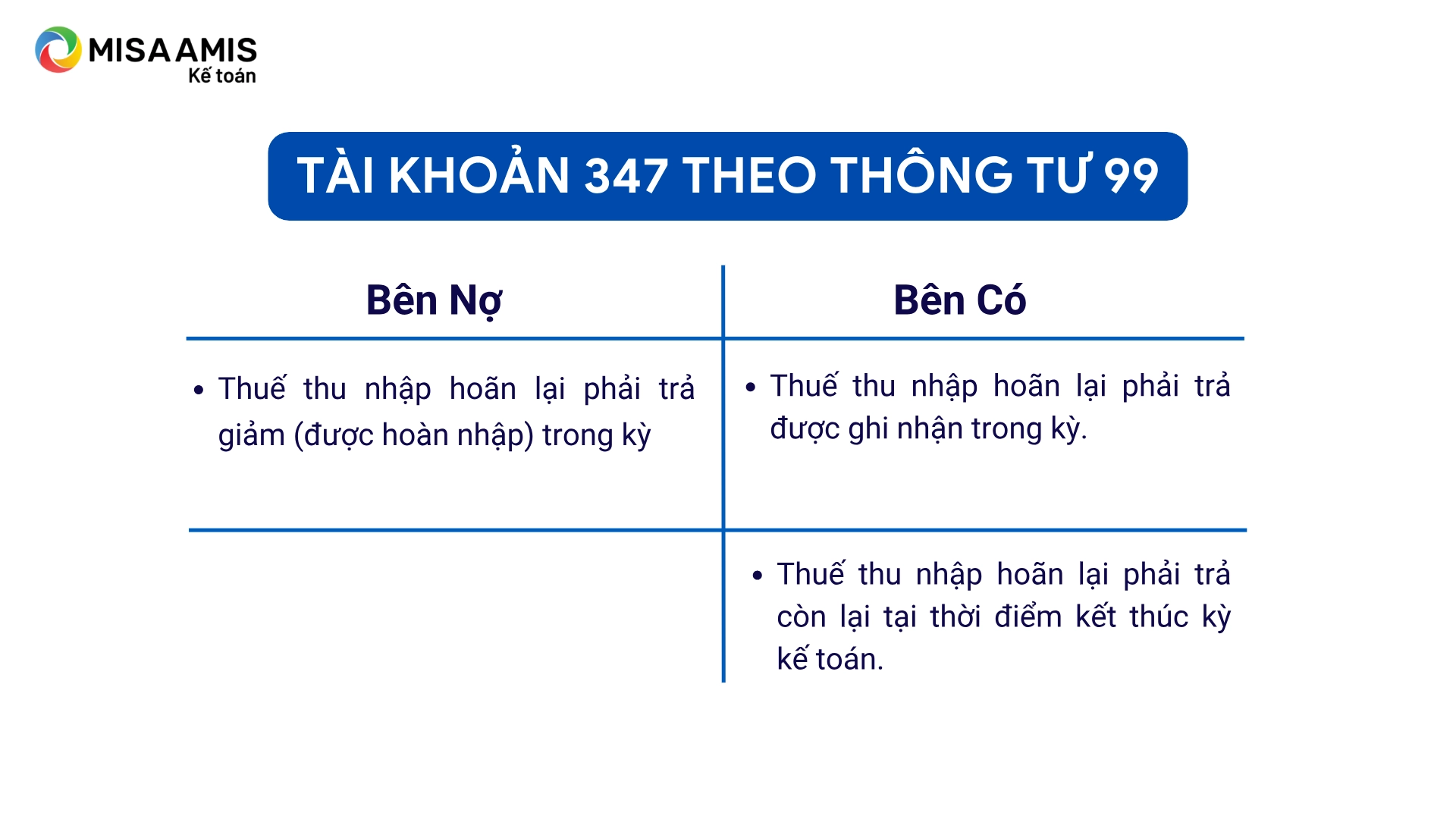 Tài khoản 347 – Thuế thu nhập hoãn lại phải trả được sử dụng để phản ánh giá trị nghĩa vụ thuế TNDN mà doanh nghiệp sẽ phải nộp trong tương lai, phát sinh từ các chênh lệch tạm thời chịu thuế tính theo kế toán (theo chuẩn mực kế toán) so với tính theo thuế.