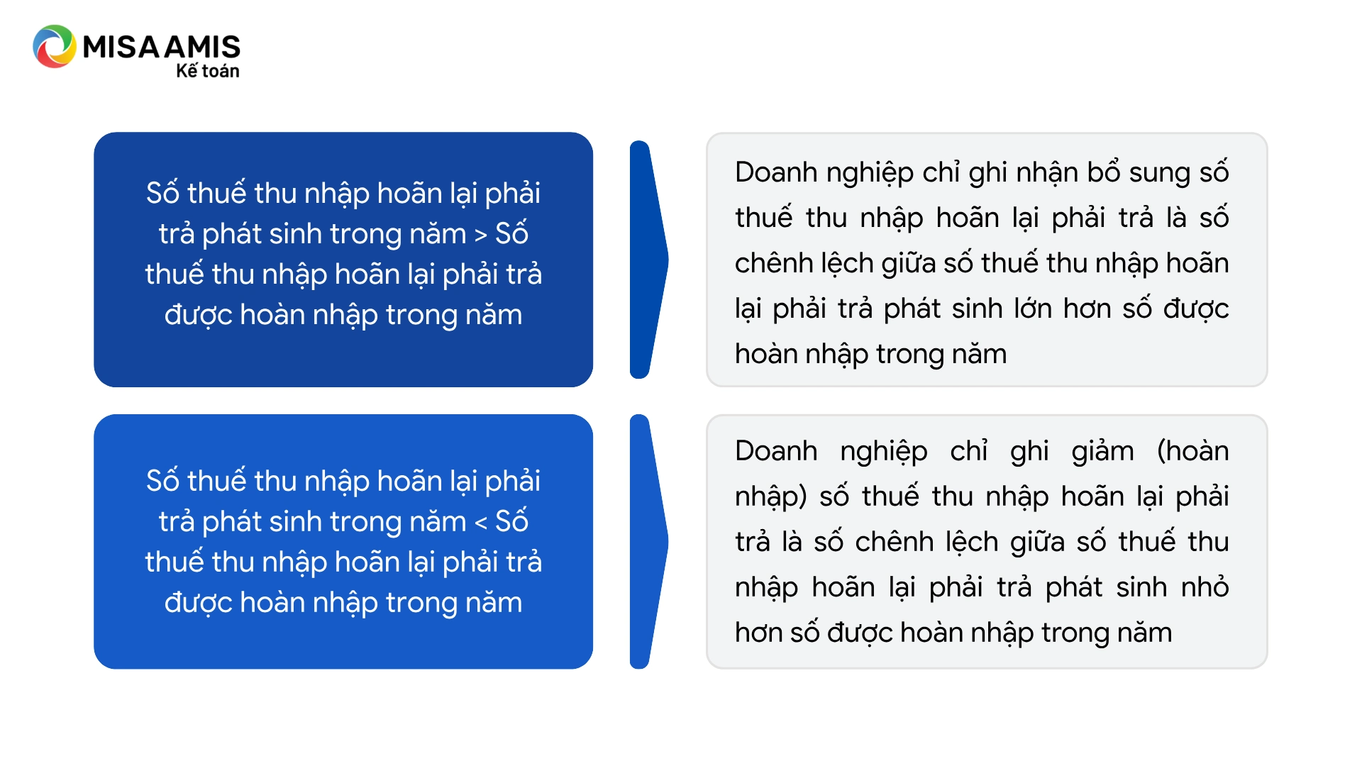 • Nếu số thuế thu nhập hoãn lại phải trả phát sinh trong năm lớn hơn số thuế thu nhập hoãn lại phải trả được hoàn nhập trong năm, doanh nghiệp chỉ ghi nhận bổ sung số thuế thu nhập hoãn lại phải trả là số chênh lệch giữa số thuế thu nhập hoãn lại phải trả phát sinh lớn hơn số được hoàn nhập trong năm;