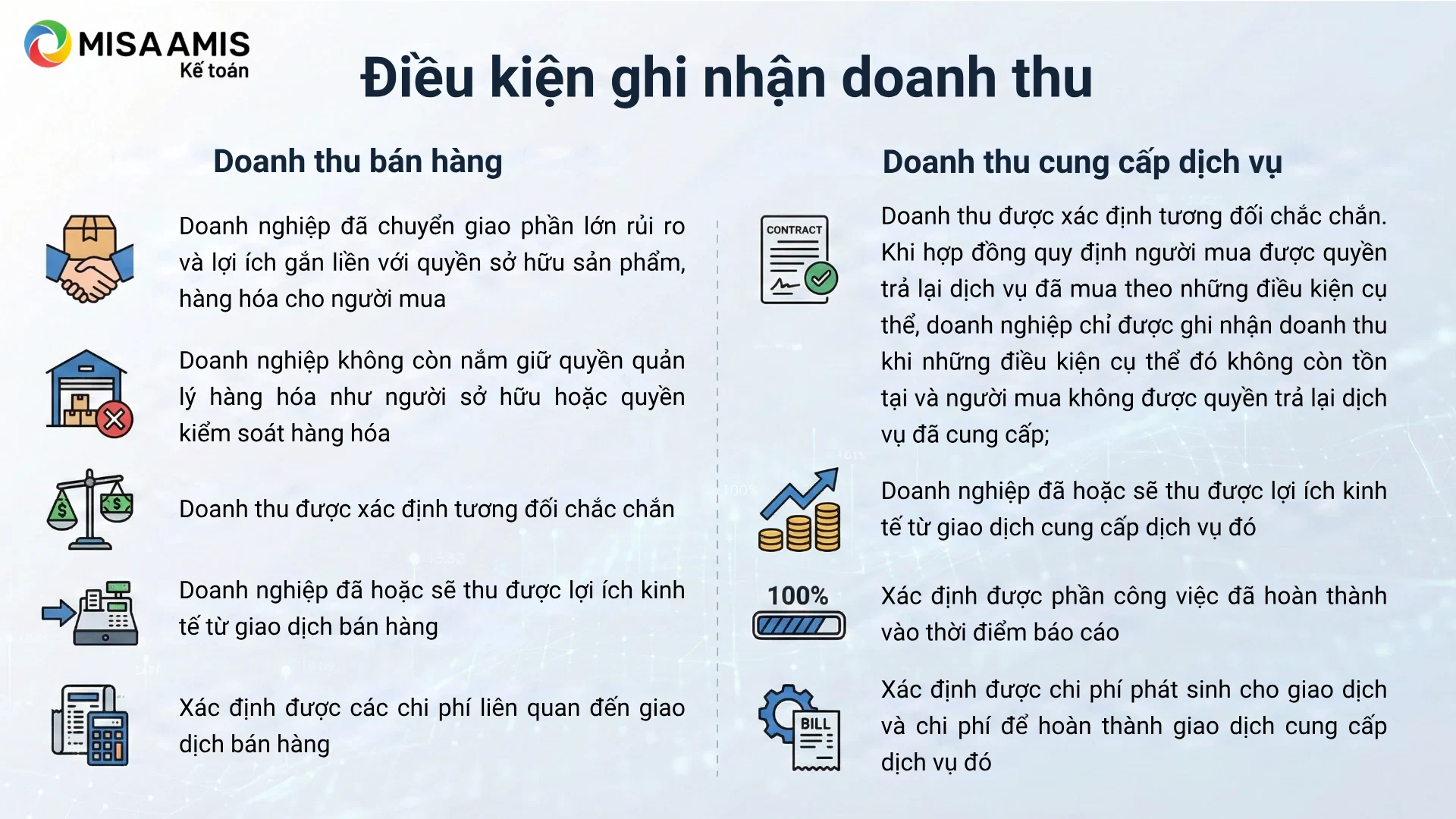 Doanh nghiệp chỉ được ghi nhận doanh thu khi đáp ứng đồng thời các điều kiện nhất định, tùy theo loại hoạt động là bán hàng hay cung cấp dịch vụ.