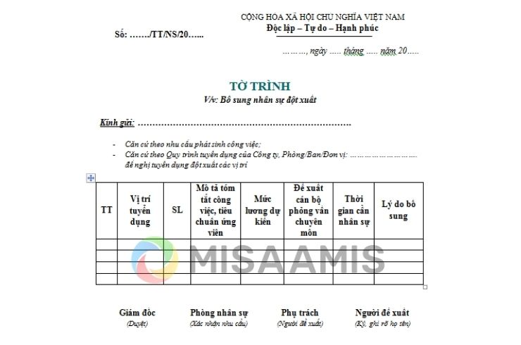 Tờ trình xin bổ sung nhân sự được sử dụng khi phòng ban phát sinh nhu cầu nhân sự. Tuy nhiên, nhiều doanh nghiệp vẫn chưa có sẵn mẫu tờ trình bổ sung nhân sự để áp dụng một cách đồng bộ. Trong bài viết này, MISA AMIS HRM sẽ cung cấp mẫu tờ trình xin tuyển dụng nhân sự mới nhất cho doanh nghiệp trong bài viết dưới đây: