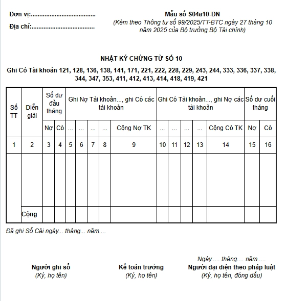Nhật ký – Chứng từ số 10 (Mẫu số S04a10-DN) dùng để phản ánh số phát sinh bên Có của các TK 121, 128, 136, 138, 141, 171, 221, 222, 228, 229, 243, 244, 333, 336, 337, 338, 344, 347, 353, 411, 412, 413, 414, 418, 419, 421 mỗi tài khoản được ghi trên một tờ Nhật ký- Chứng từ.