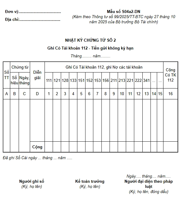 Nhật ký – Chứng từ số 2 được sử dụng để ghi nhận các khoản phát sinh bên Có của tài khoản 112 “Tiền gửi không kỳ hạn”, đối ứng với Nợ của các tài khoản có liên quan.