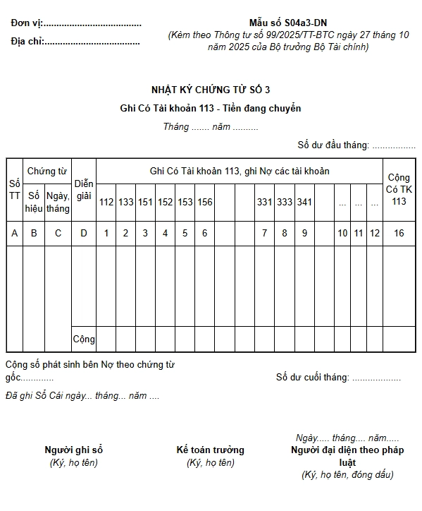 Nhật ký – Chứng từ số 3 (Mẫu số S04a3-DN) dùng để phản ánh số phát sinh bên Có TK 113 “Tiền đang chuyển” đối ứng Nợ với các tài khoản có liên quan.