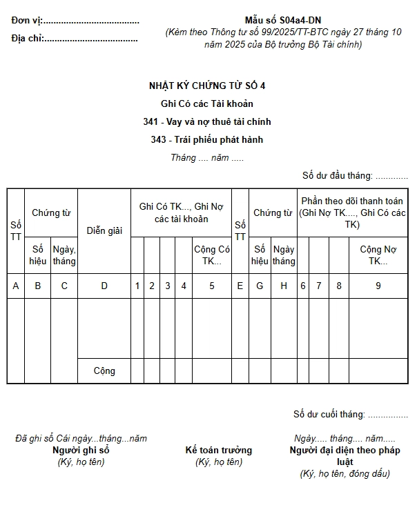 Nhật ký chứng từ số 4 (Mẫu số S04a4-DN) dùng để phản ánh số phát sinh bên Có các TK 341 “Vay và nợ thuê tài chính”, TK 343 “Trái phiếu phát hành” đối ứng Nợ của các tài khoản có liên quan.
