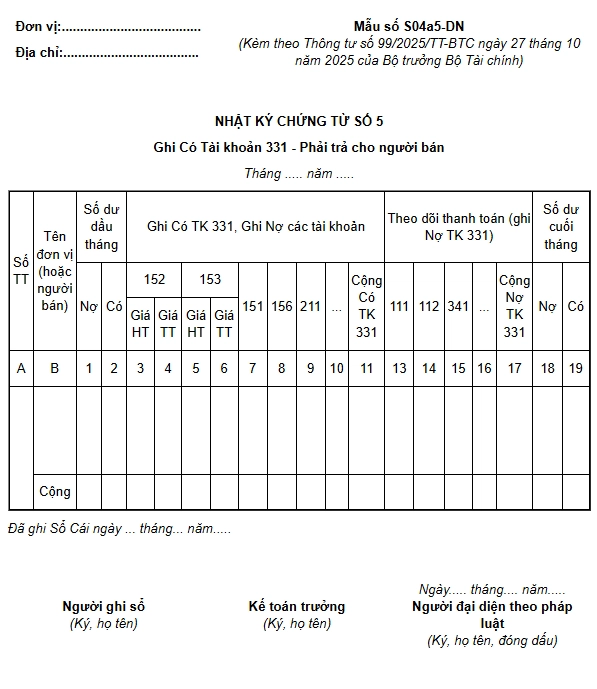 Nhật ký chứng từ số 5 (Mẫu số S04a5-DN) dùng để tổng hợp tình hình thanh toán và công nợ với người cung cấp vật tư, hàng hóa, dịch vụ cho doanh nghiệp (Tài khoản 331 “Phải trả cho người bán”).