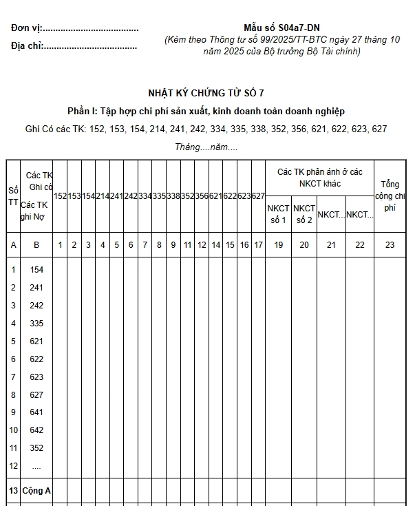 Nhật ký chứng từ số 7 (Mẫu số S04a7-DN) dùng để tổng hợp toàn bộ chi phí sản xuất, kinh doanh của doanh nghiệp và dùng để phản ánh số phát sinh bên Có các tài khoản liên quan đến chi phí sản xuất, kinh doanh bao gồm, TK 152, TK 153, TK 154, TK 214, TK 241, TK 242, TK 334, TK 335, TK 338, TK 352, TK 621, TK 622, TK 623, TK 627 và một số tài khoản đã phản ánh ở các Nhật ký – Chứng từ khác, nhưng có liên quan đến chi phí sản xuất, kinh doanh phát sinh trong kỳ, và dùng để ghi Nợ các tài khoản 154, 621, 622, 623, 627, 242, 2413, 335, 641, 642…