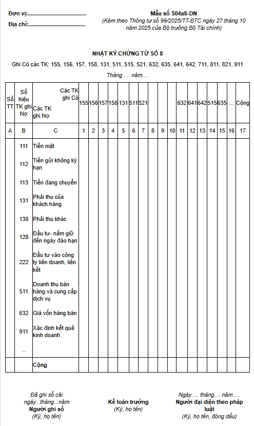 Nhật ký – Chứng từ số 8 (Mẫu số S04a8-DN) dùng để phản ánh số phát sinh bên Có TK 155, 156, 157, 158, 131, 511, 515, 632, 635, 641, 642, 711, 811, 821, 911.