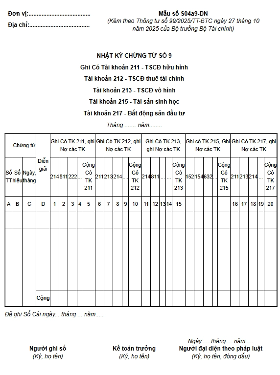 Nhật ký – Chứng từ số 9 (Mẫu số S04a9-DN) dùng để phản ánh số phát sinh bên Có TK 211 “TSCĐ hữu hình”, TK 212 “TSCĐ thuê tài chính”, TK 213 “TSCĐ vô hình”, TK 215 – Tài sản sinh học, TK 217 “Bất động sản đầu tư”.