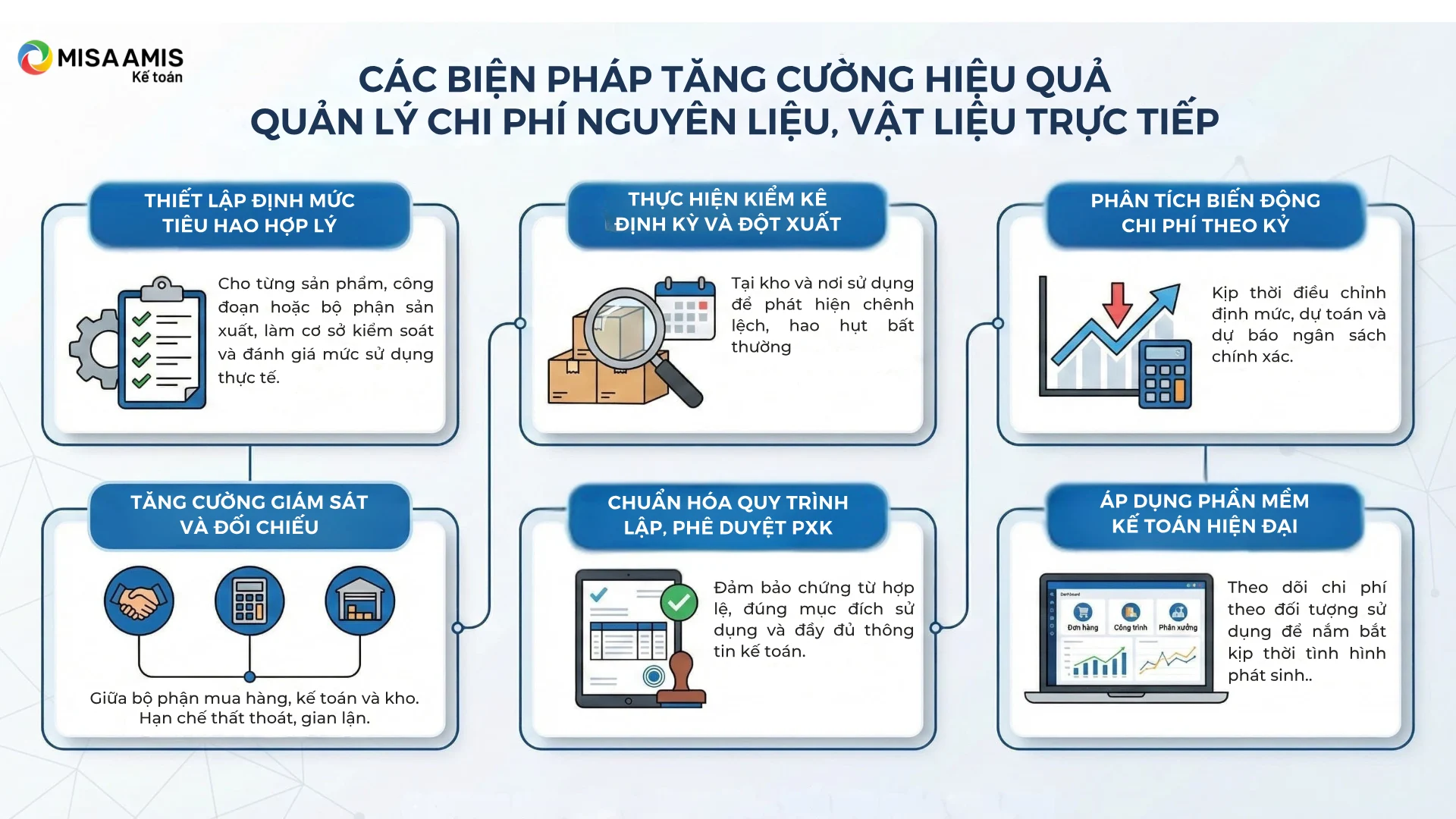Để kiểm soát tốt chi phí nguyên liệu, vật liệu trực tiếp (TK 621) – một khoản mục chi phí quan trọng trong cơ cấu giá thành – doanh nghiệp cần áp dụng đồng bộ các biện pháp cả về quy trình, công nghệ và tổ chức. Dưới đây là một số giải pháp thực tiễn có thể triển khai: